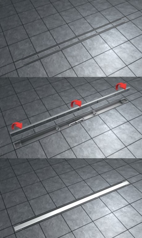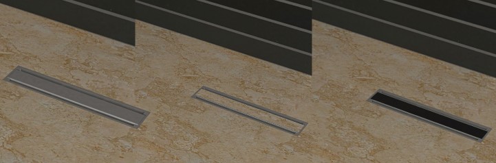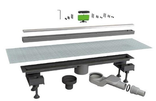Łazienkowy odpływ liniowy z dwustronnym rusztem ze stali nierdzewnej AISI316 typu SLIM, zamontowany w rynnie podłogowej z ABS.