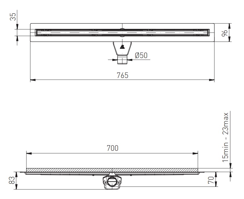 Odwodnienie liniowe podłogowe ELEGANCE, okvir ze stali nierdzewnej, ruszt STANDARD/CUSTOM 700 mm, Ø 50 mm, czarny