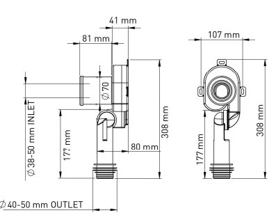 Syfon pisuarowy, wertykalny i horyzontalny, redukcja gumowa FI 50/40 odejście proste FI 40