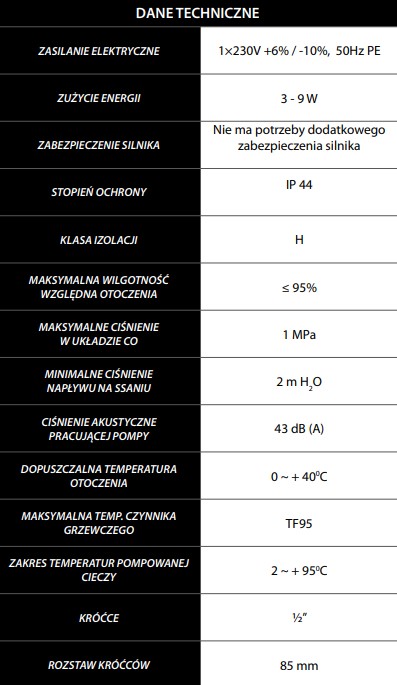 - Możliwość automatycznego lub manualnego dostosowania parametrów pompy do właściwości instalacji.