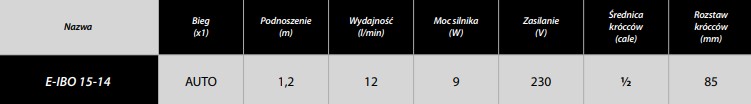 Pompy E-IBO 15-14 przeznaczone są do pracy ciągłej przy wymuszaniu obiegu ciepłej wody użytkowej oraz w niewielkich systemach grzewczych. Pompy mogą być wykorzystywane w układach wentylacyjnych i klimatyzacyjnych. Wykorzystanie pomp cyrkulacyjnych pozwala na znaczną oszczędność zużycia wody. W porównaniu z tradycyjnymi pompami cyrkulacyjnymi, dzięki wykorzystaniu w rotorze silnika magnesu stałego, zużycie energii pomp z serii E-IBO jest bardzo niskie i może osiągnąć, w zależności od instalacji, nawet 3W. Pompy wyposażone zostały w sferyczny wirnik pracujący w różnych płaszczyznach.