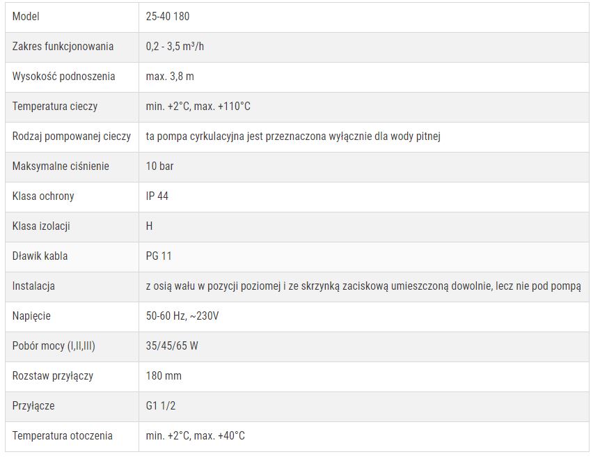 Pompa cyrkulacyjna wody pitnej. Korpus pompy wykonany jest z żeliwa, obudowa odlana z aluminium, a wirnik uformowany z tworzywa. Wysokiej jakości silnik dwubiegunowy, asynchroniczny, nie wymaga ochrony przed przeciążeniem, posiada trzy prędkości obrotowe, regulowane za pomocą specjalnego przełącznika zamontowanego na skrzynce zaciskowej co pozwala dostosować pracę pompy do wymagań użytkownika. Posiada atest PZH.