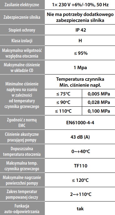 - Dopuszczalna temperatura pompowanej cieczy: od 2°C do 110°C