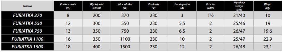 Pompa ta należy do serii solidnych, żeliwnych pomp zatapialnych, przeznaczonych do pompowania ścieków domowych, a także do odwadniania zalanych pomieszczeń. Wyposażona jest w skuteczny i wytrzymały śrubowy rozdrabniacz, o konstrukcji, która niemalże uniemożliwia zablokowanie. Niezawodny silnik IBO, zabezpieczony jest przed przeciążeniem poprzez system zamontowany na kablu, który automatycznie wyłączy pompę w przypadku ryzyka przeciążenia. Żeliwo, z którego wykonana została pompa, jest bardzo odporne na wszelkiego rodzaju uszkodzenia mechaniczne, a także na działanie czynników chemicznych, z jakim pompa kontaktuje się pracując w ściekach. Solidna i trwała konstrukcja, wydajność oraz korzystna cena sprawiają, że pompy z serii Furiatka są jednymi z najpopularniejszych urządzeń tego typu na polskim rynku.