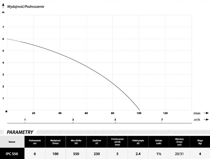 Pompa zatapialna, wyposażona w zintegrowany wyłącznik, przeznaczona do pompowania wody czystej i lekko zanieczyszczonej niezawierającej elementów szlifujących (np.piasek). Pompa zatapialna IPC 550 wyposażona została w wydajny silnik elektryczny o napięciu 230V. Jednostka generuje 550 W mocy, a to pozwala na uzyskanie maksymalnej wydajności tłoczenia na poziomie 133 litrów na jedną minutę pracy pompy oraz podnoszenie cieczy do maksymalnie 7,5 metra. W pompie zastosowano króciec tłoczny DN25, którego średnica wynosi 1 cal.