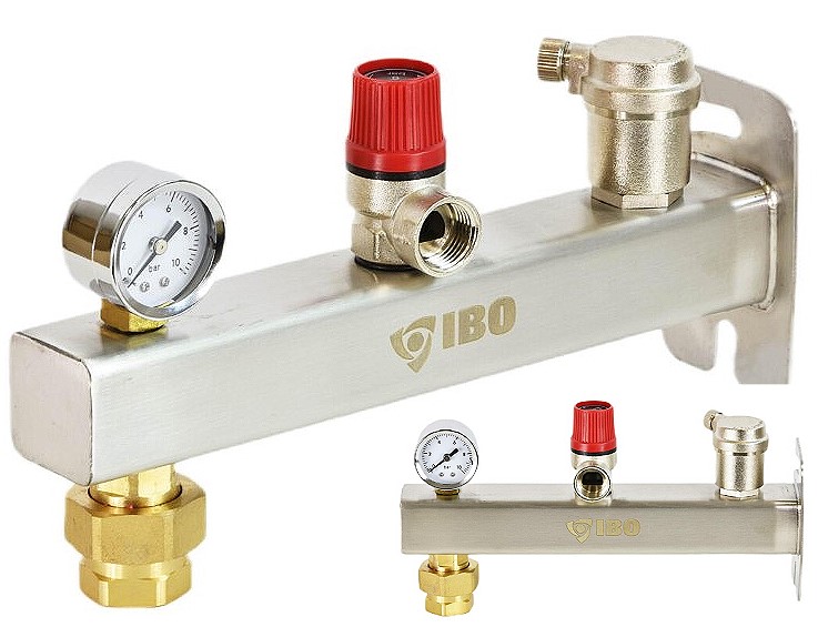 Grupa bezpieczeństwa IBO INOX to urządzenie służące do montażu naczynia przeponowego oraz mające na celu kontrole i zabezpieczenie przed nadmiernym wzrostem ciśnienia w instalacji grzewczej. Grupa bezpieczeństwa jest wyposażona w manometr, odpowietrznik automatyczny, zawór bezpieczeństwa oraz zawór serwisowy.