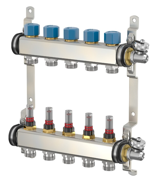 Kolektor zasilający zawiera 2 - 12 szt. zintegrowanych przepływomierzy, 0 - 5 l/m, kolektor powrotny zawiera 2 - 12 szt. zintegrowanych wkładek zaworów termostatycznych (możliwość doposażenia w siłowniki, M 30 x 1,5), skok zaworu 2,9 mm.
