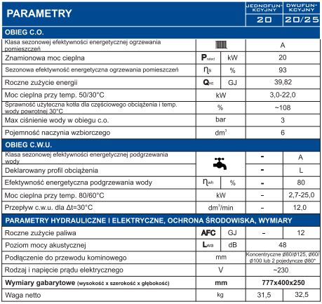 - klasa sezonowej efektywności energetycznej podgrzewacza wody: A (dot. kotłów dwufunkcyjnych)