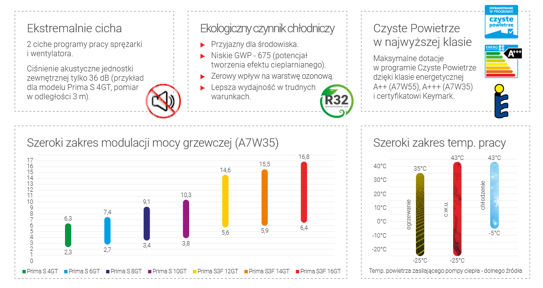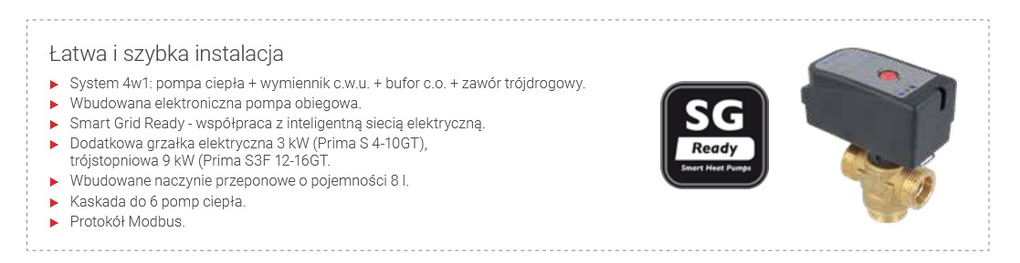 Zestaw grzewczy PRIMA S 10GT G200 wykorzystuje energię odnawialną do kompleksowej obsługi budynku: ogrzewania, chłodzenia i grzania wody użytkowej. W skład zestawu wchodzą: powietrzna pompa ciepła Prima S 10GT (Split), wymiennik c.w.u. SGW(S) Tower Grand 200, bufor wiszący (sprzęgło hydrauliczne) SG(B) 40, komplet elektryczny GE z grzałką 2kW 230V - K6/4" i zawór trójdrogowy z siłownikiem do realizacji funkcji c.w.u.. Zestaw wyróżnia wiele atutów do których można zaliczyć: pracę pompy w temperaturze do - 25°C, temperatura na wyjściu z pompy ciepła do 65°C, ekologiczny czynnik chłodniczy R32, 2 tryby pracy cichej, sterowanie online poprzez aplikację, szybki podgrzew ciepłej wody użytkowej - tryb TURBO oraz powiększona wężownica o powierzchni 2 m2 w wymienniku SGW(S) Tower Grand 200, wydajna izolacja z pianki poliuretanowej w buforze i wymienniku c.w.u., dotacje w programie Czyste Powietrze dzięki klasie energetycznej A++ (A7W55) i certyfikatowi Keymark. Zasilanie pompy ciepła 230V.