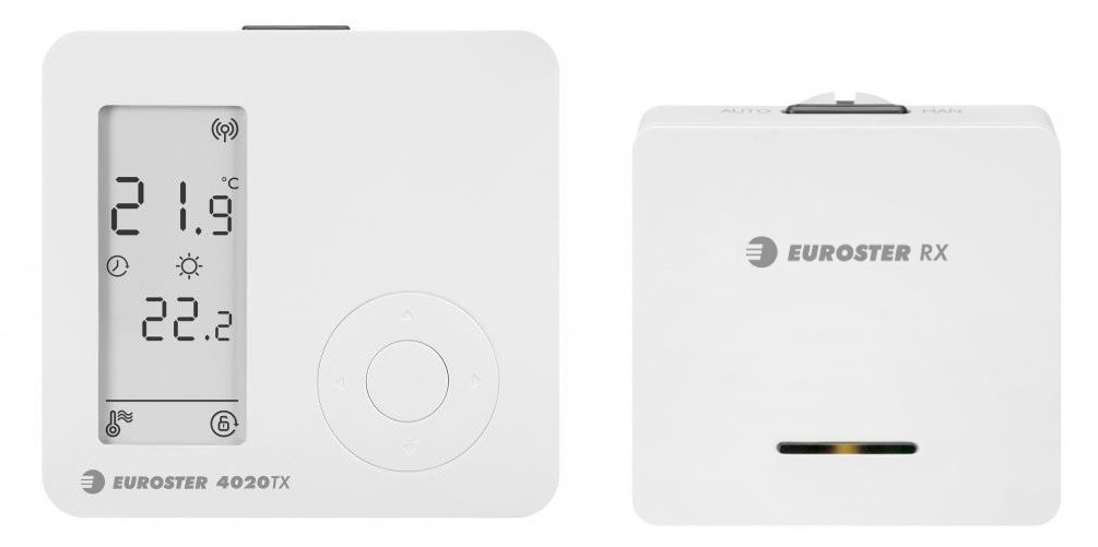 Euroster 4020TXRX to nowoczesny, wielofunkcyjny regulator temperatury z dużym, podświetlanym ekranem LCD oraz funkcją czasowego obniżenia temperatury komfortowej. Urządzenie przeznaczone jest do sterowania źródłem ciepła (np. kotłem, pompą ciepła) bez potrzeby prowadzenia przewodów pomiędzy regulatorem a odbiornikiem. Dzięki wsparciu dla dwóch czujników temperatury oraz trybowi PWM, doskonale sprawdza się w systemach ogrzewania podłogowego.