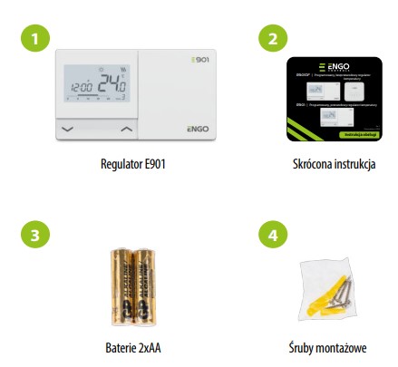 E901 to natynkowy przewodowy regulator temperatury. Służy do sterowania systemami i urządzeniami grzewczymi (m.in. kotłami gazowymi, pompami ciepła) i chłodzącymi. Umożliwia ustawienie optymalnej temperatury w pomieszczeniach. Może pracować zgodnie z ustalonym harmonogramem. Musi zostać podłączony bezpośrednio do urządzenia, którego pracą ma albo do listwy centralnej.
