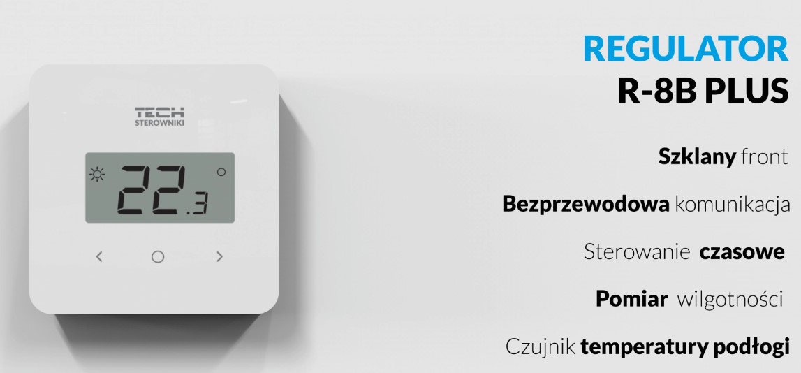 Regulator pokojowy R-8b Plus przeznaczony jest do współpracy z listwami firmy Tech. Regulator ten montuje się w poszczególnych strefach grzewczych. Przesyła on informację o aktualnej temperaturze oraz wilgotności do listwy, która na tej podstawie steruje zaworami termostatycznymi (otwierając je, gdy pomieszczenie jest niedogrzane i zamykając po osiągnięciu temperatury zadanej w pomieszczeniu).