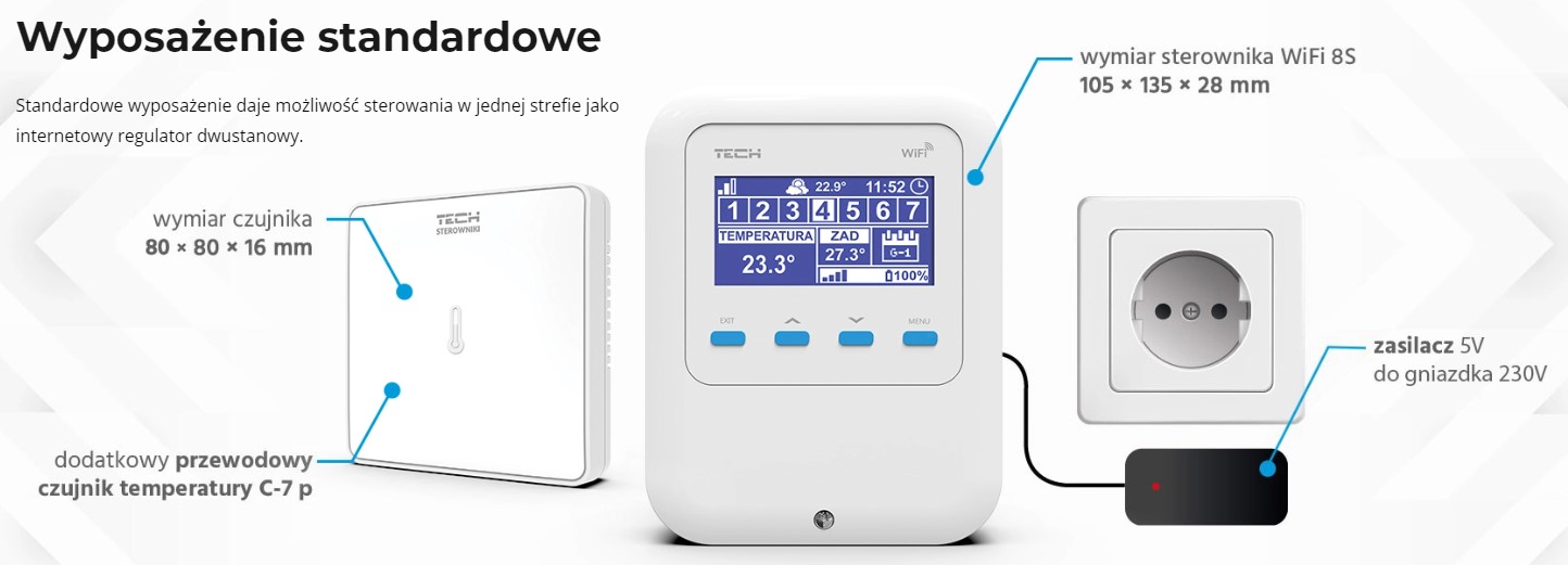 Dzięki możliwości sterowania aż 8 strefami, regulator zapewnia wszechstronną kontrolę nad ogrzewaniem w budynku.