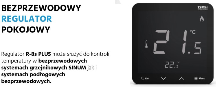 Regulator R-8s PLUS może służyć do kontroli temperatury w bezprzewodowych systemach grzejnikowych SINUM jak i systemach podłogowych bezprzewodowych.