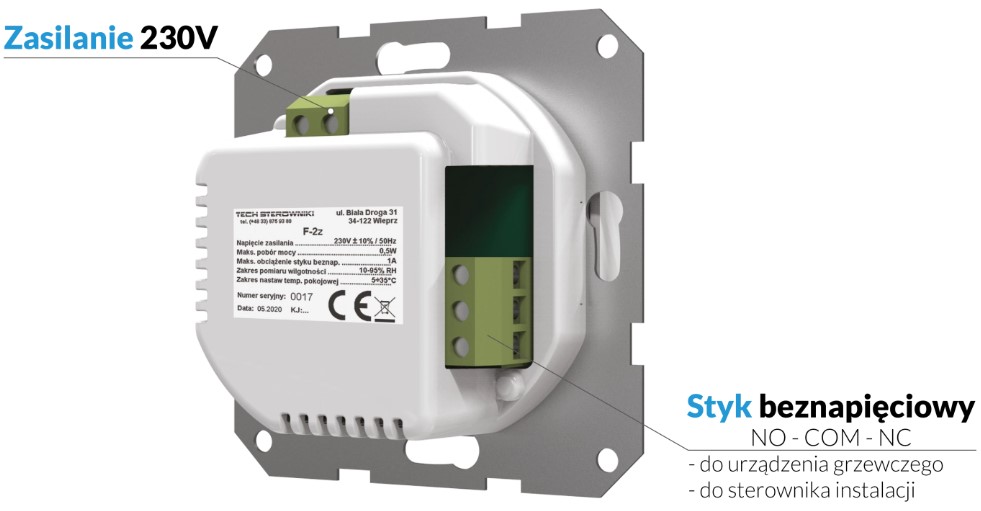Przewodowy regulator pokojowy F-2z v1 przeznaczony jest do sterowania urządzeniem grzewczym. Regulator ma za zadanie utrzymanie zadanej temperatury w pomieszczeniu przez przesłanie sygnału do urządzenia grzewczego z informacją o osiągnięciu temperatury zadanej do wymaganej wartości.