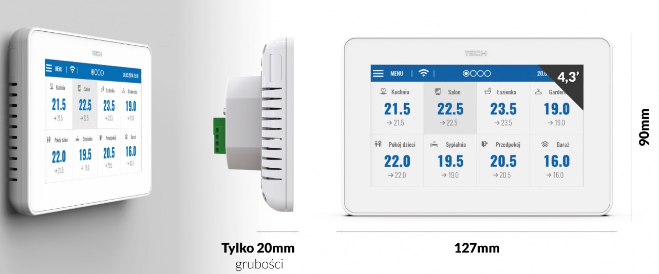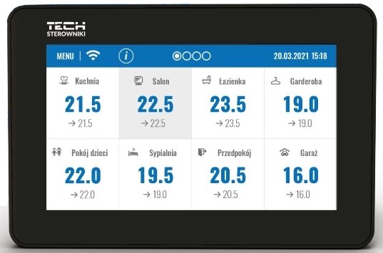 Czytelny, dotykowy panel umożliwia łatwe zarządzanie pracą podrzędnych urządzeń. Aby dokonać ustawień w podrzędnej sterownikowi strefie, wystarczy kliknąć obszar ekranu z informacją o jego stanie. Wygląd wyświetlacza panelu kontrolnego sterowników ogrzewania można dopasować do swoich potrzeb, korzystając z funkcji ustawienia ekranu. Można m.in. ustawić wygaszacz ekranu w postaci zegara albo daty. Dodatkowo użytkownik ma możliwość wyboru wersji kolorystycznej ekranu sterownika oraz włączenia lub wyłączenia dźwięku klawiszy.