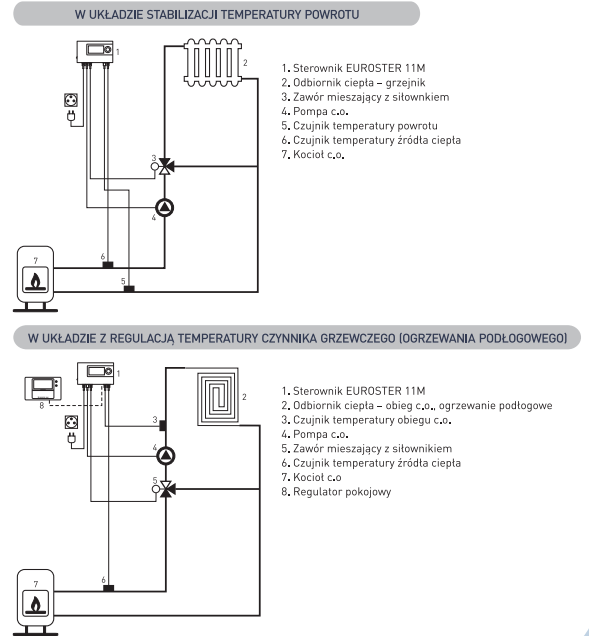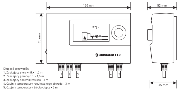 Euroster 11M to elektroniczny, programowalny sterownik przeznaczony do współpracy z zaworem trójdrożnym z siłownikiem oraz pompą obiegową c.o. Jego głównym zadaniem jest utrzymywanie zadanej temperatury wody w instalacji grzewczej – zarówno na zasilaniu, jak i na powrocie – co chroni kocioł przed zawilgoceniem, zwiększa jego żywotność oraz poprawia efektywność pracy całego układu c.o.