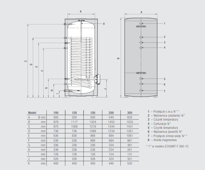 ECOUNIT F-1C to wysokiej klasy zasobniki c.w.u. z 1 wężownicą spiralną i podłączeniem bocznym. Wyposażone są w ochronną anodę magnezową, otwór rewizyjny i skuteczną izolację termiczną. ECOUNIT F-1C posiadają wewnętrzne pokrycie emalią ceramiczną, która poddana jest specjalnemu procesowi w celu utworzenia gładkiej, jednolitej, nieprzyczepnej warstwy szkliwa. Stanowi ona skuteczne zabezpieczenie antykorozyjne oraz gwarantuje doskonałą higienicznie jakość wody. ECOUNIT F-1C charakteryzują się wysoką wydajnością oraz minimalnymi stratami postojowymi.