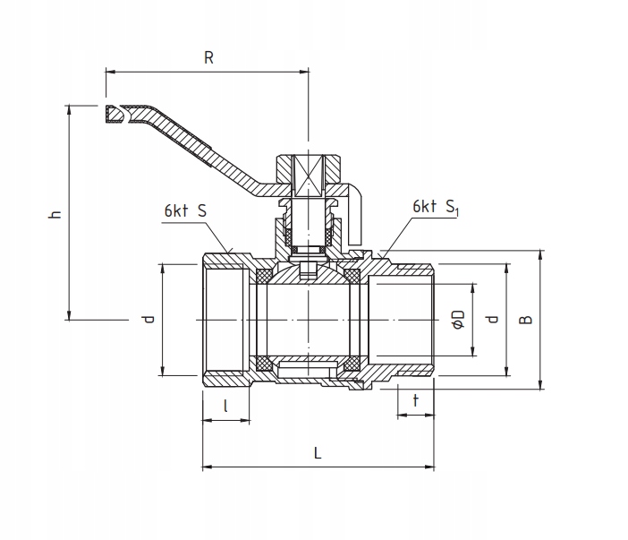 Zawór wodny kulowy mosiężny z metalową rączką i dławikiem.