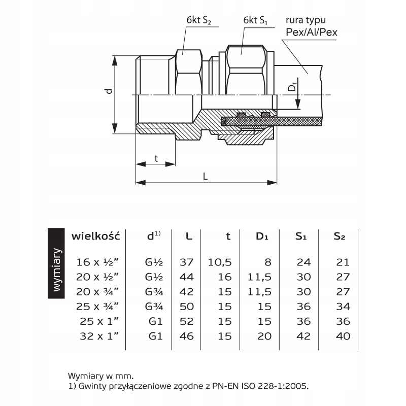 - Wymiary 16x1/2" GZ, dług. 37mm