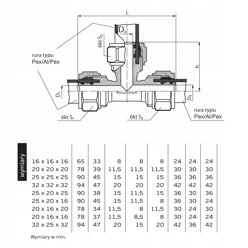 TRÓJNIK REDUKCYJNY PEX SKRĘCANY 20mm x 16mm x 20mm